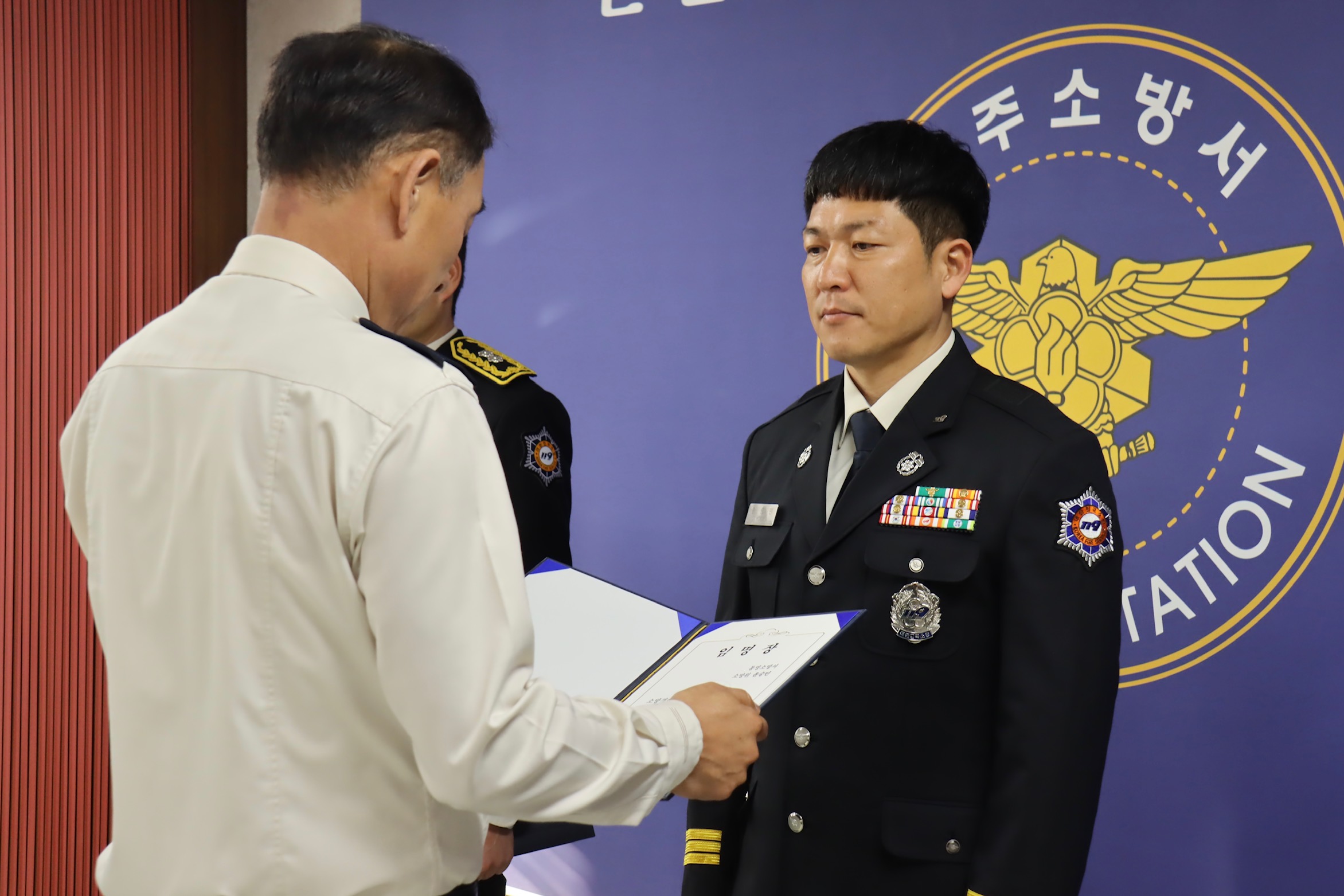 내용: 소방경 승진자·전입자 임용장 수여식 및 서장님 당부말씀 등