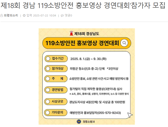 (언론보도)의령소방서, 제18회 경남119소방안전 홍보영상 경연대회 참가자 모집(2025. 7. 22.)